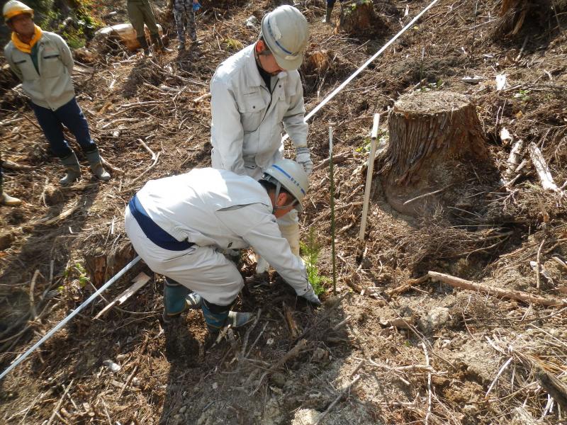 午後は、あらかじめ設定した試験地に異動し参加者全員で植栽体験をしました。