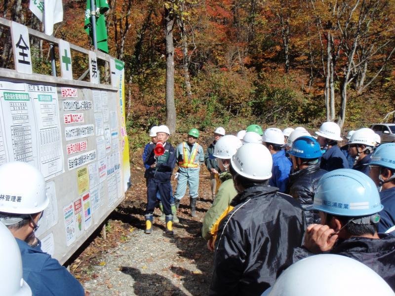 当日は、今の時期には珍しく暖かく、好天にも恵まれ、参加事業体17社24名、関係者29名、総勢53名が参加し、現在施工中の後長根沢治山工事現場で安全などに関する掲示板について、弘前労働基準監督署からの現地指導、その後、場所を弘前市中央公民館岩木館に移し、弘前労働基準監督署から「林業における労働災害の現状と課題」、また、林業・木材製造業労働災害防止協会青森県支部から「労働安全衛生規則の一部改正について」の講話、意見交換を行い、今後も安全管理体制をしっかりと確立し、安全意識の高揚を図り、労働災害を発生させないように努力することを約束して閉会しました。
