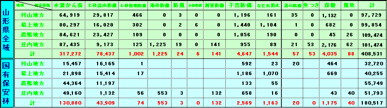 | 村山地方 | 国有林 | 官行造林 | 民有林 | 計 |