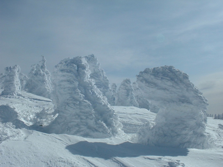 出発地点~ミズナラの冬芽~ブナの冬芽~ツルウメモドキ実~お清水の森(ねじれ杉)~中丸山~樹氷原~〃~朝日連峰~飯豊連峰~月山~御田神避難小屋と熊野岳~お釜~熊野岳(熊野神社)